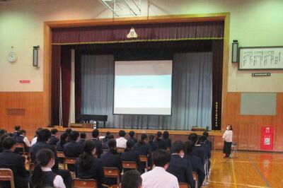3年生「いのちの授業」講演会 投稿: 学校管理者 (17:08) カテゴリー: 今日の出来事 連日、3者相談のための保護者の皆様来校ありがとうございます。 4校時に3年生は「いのちの授業」をNPOさやま保育サポートの会代表で元西部文理大学看護学部教授の大賀明子先生をお招きしてご講演をいただきました。 難しい話も多かった中ですが、「涙が出そうになった」との感想もありました。 「プレコンセプションケア」という聞きなれない話もありましたが、若年層から人生設計をさせていくこと、大変貴重な学びになったことと思います。 0 -
